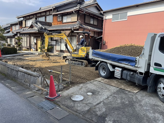 着工後の工事の様子は、安全祈願後に現状の解体、撤去、排水の設置、水道の移設、基礎地盤の改修、仕上げの様子など写真をご覧ください。